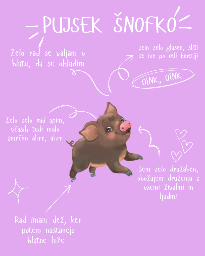 - Igrivo zgodbo o pujsu Šnofku, ki otrokom približa svet onomatopej – besed, ki posnemajo zvoke in so odlične za razvoj govora.